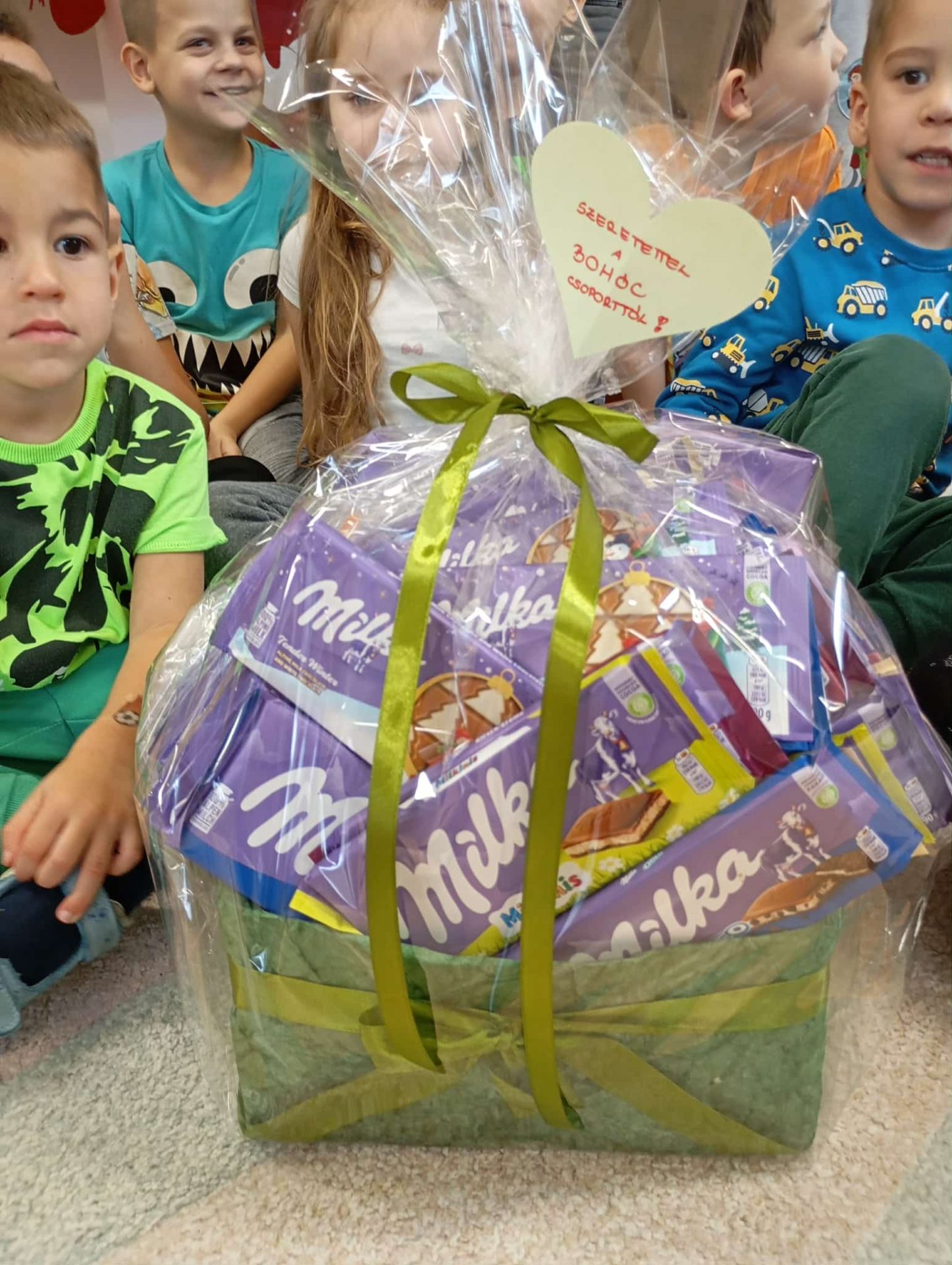 Az óvoda valamennyi csoportja egyszerre adta át a gyógyuló gyermekek számára gyűjtött édességeket. Nagy örömömre óriási, színes rajzokkal és egy doboznyi csodaszépen díszített mézeskaláccsal is megleptek. Már maga az a pillanat megható volt, amikor a kicsik izgatottan sorakoztak az átadáshoz. Az ünnepélyes hangulatot tovább emelte, hogy közösen énekeltük el a „Hull a pelyhes fehér hó” című dalt.