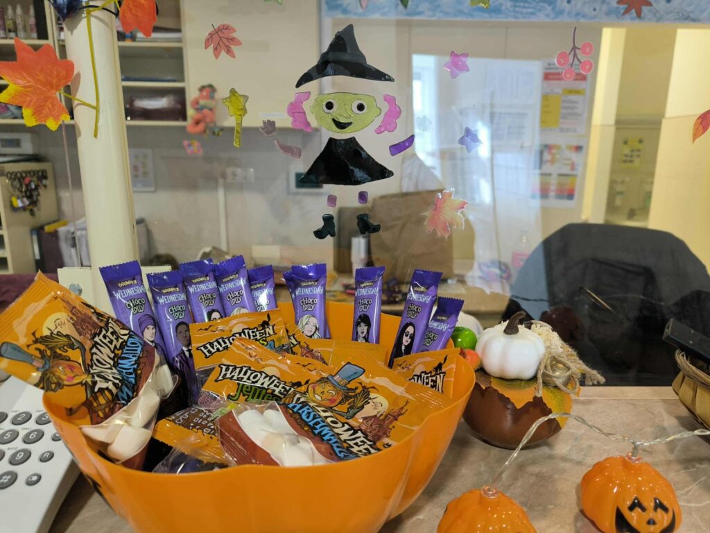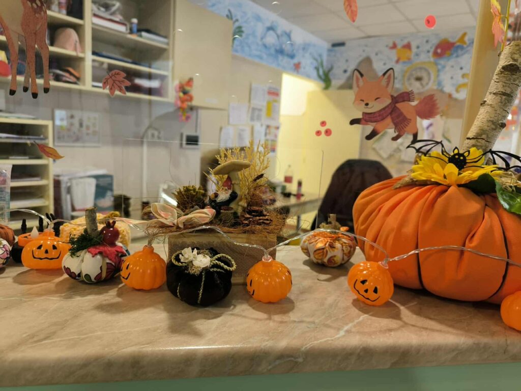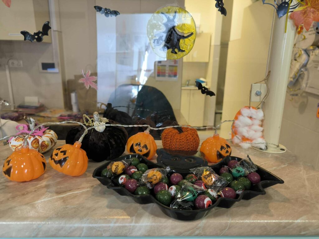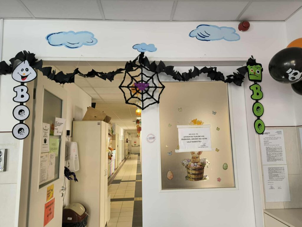 Gyönyörűen feldíszített Osztály várta a kisbetegeket, hangulatos díszek, pókok, tökök, és az éhes szájaknak egy kis pizza.