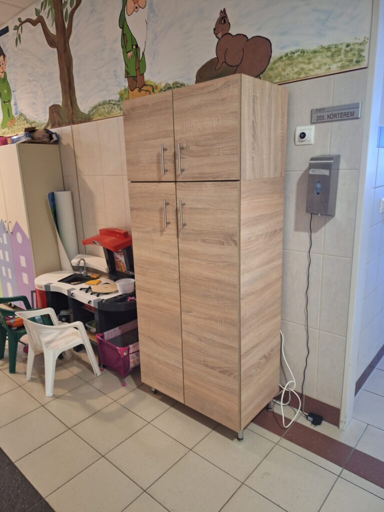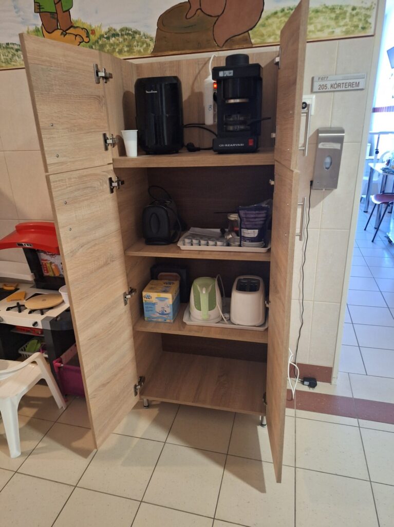 Egyik kisbetegünk édesapja ajánlotta fel, hogy az Osztály folyosójára elkészít egy kávés szekrényt.