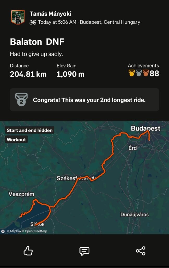 a mászás végét de sajnos nem volt mit tenni. Füredre beérve adtam egy kis időt magamnak, majd meghoztam azt a nehéz döntést, hogy feladom. 204 kilométer után feladtam a saját kihívásomat azért, hogy ha rendbe jövök gyűjthessek még másoknak és ne másoknak kelljen az én felépülésemért