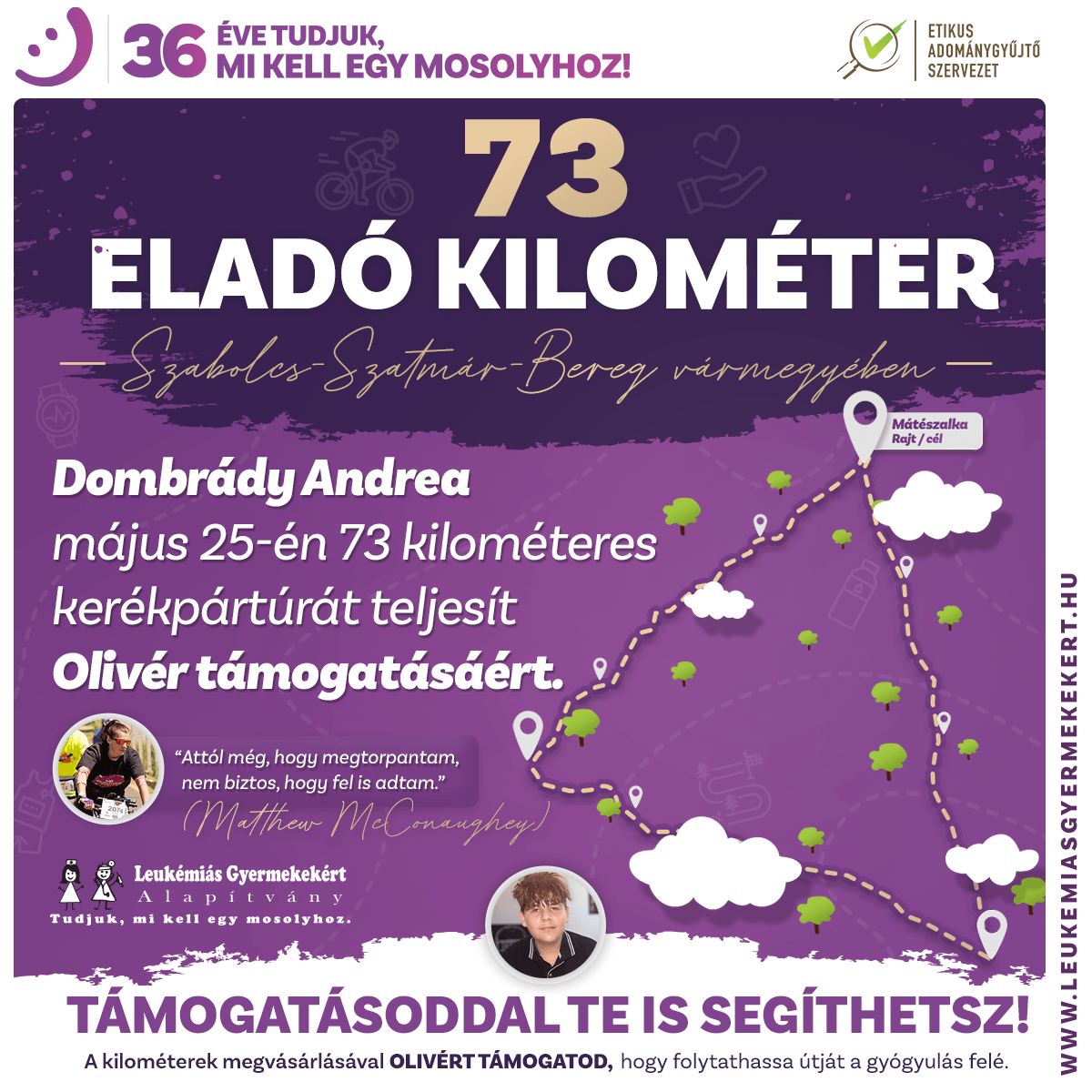 Dombrády Andrea május 25-én 73 kilométeres kerékpártúrát teljesít Olivér támogatásáért.